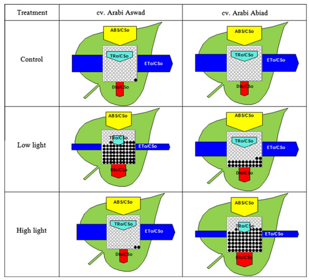 This type of model is highly informative, as it summarizes the state of the photosynthetic apparatus in a single image. In the example shown above, two barley cultivars were compared under high‑light and low light conditions. From the flux pattern, it becomes clear that the cultivar ‘Arabi Aswad’ (left) is more capable of handling high light, having a larger electron transport flux, lower dissipation flux, and more active reaction centers. The cultivar ‘Arabi Abiad’ (right) is better adapted to low light.
