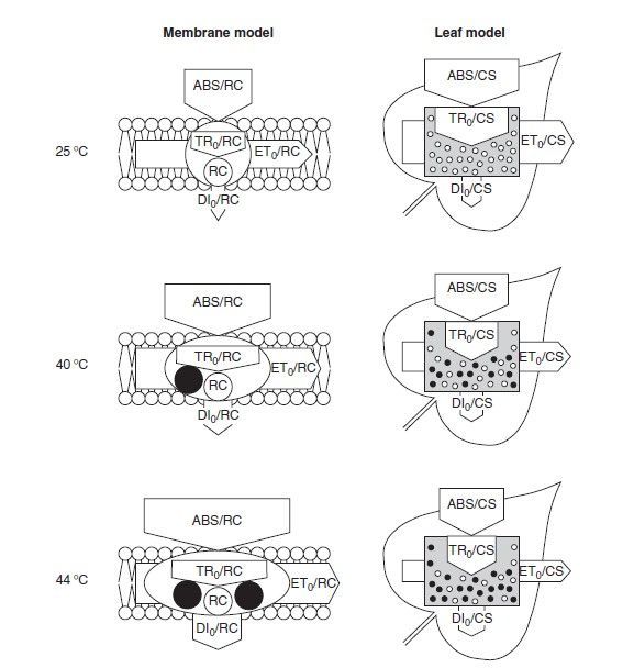 The model can also be expressed as a membrane model, showing the fluxes per reaction center (RC). See image below. Here, the effect of heating on the membrane model is described by Strasser as: