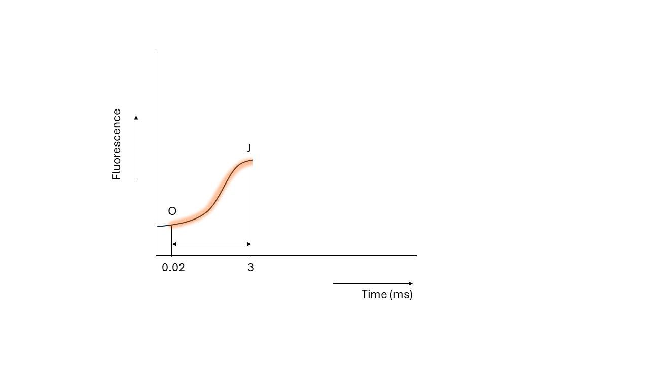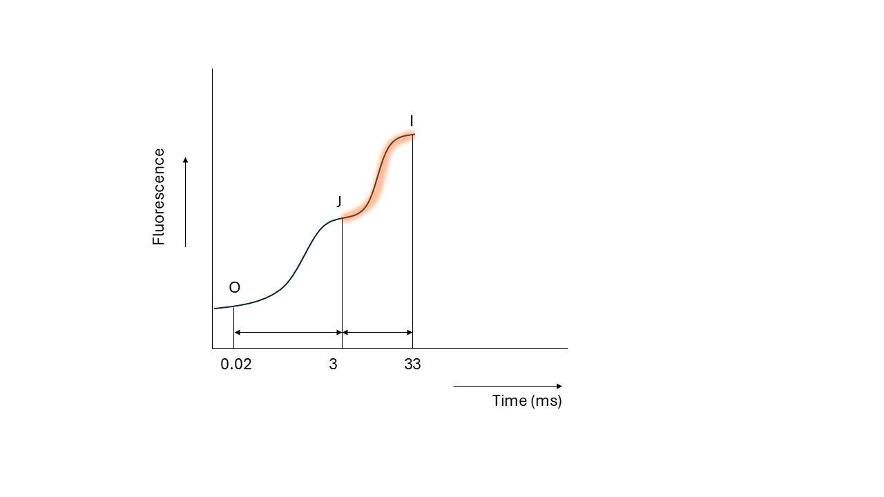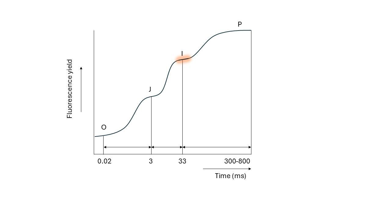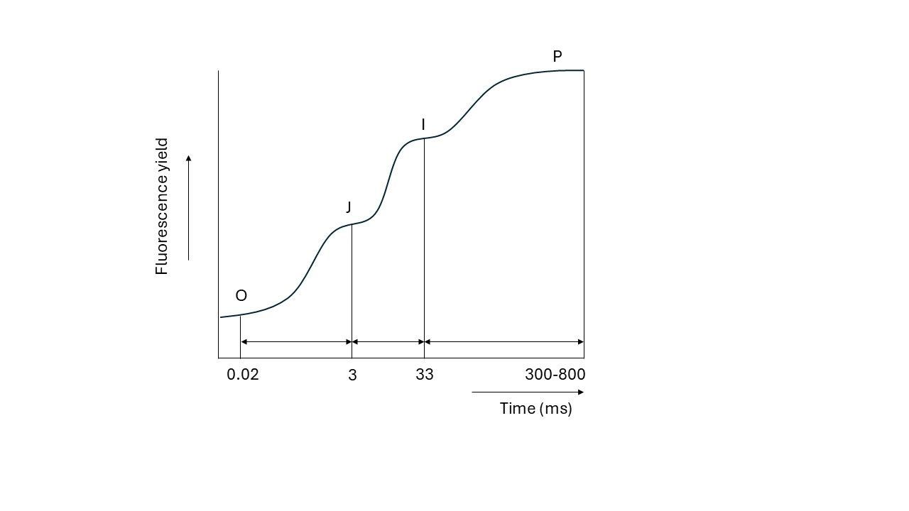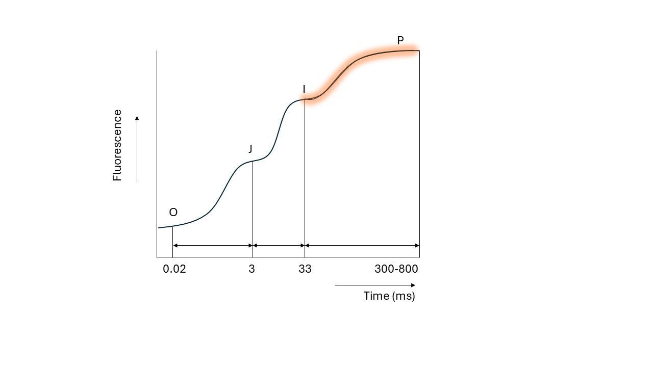 As seen, the fluorescence level rises in three steps (Strasser called it ‘triphasic kinetics’). These steps are called the J, I and P plateau. The first plateau, “J”, appears within 3 milliseconds, followed by the ‘I’ plateau at approximately 33 milliseconds. Finally, the “P” plateau marks the ‘peak’ or maximum fluorescence, usually after around 300 to 800 milliseconds.